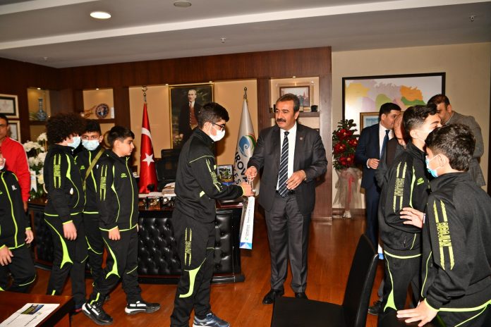Adana’ya turnuva için gelen Azerbaycan’da çocuklara futbol eğitimi veren Tahsil Cumhuriyet İdman Merkezi hoca ve sporcuları Çukurova Belediye Başkanı Soner Çetin’i ziyaret etti.