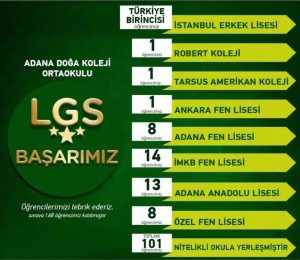 Adana Doğa Koleji Ortaokul Öğrencisi Bertuğ Kaan Atay, Milli Eğitim Bakanlığı Liselere Giriş Sınavı (LGS)’de 500 tam puan alarak Türkiye 1.si oldu. Ortaokul Müdürü Deniz Yılmaz, LGS’nin yoğun ve zorlu geçen bir süreç olduğunu belirterek, “Bu süreci Adana Doğa Koleji Ortaokul kademesinin deneyimli kadrosuyla başarılı bir şekilde sonuçlandırdık. Her şeyden önce başarıya inandık ve çok çalıştık. Ortada çok büyük emek vardı. Emeğimizin karşılığını öğrencilerimizin başarılarıyla ve velilerimizin takdirleriyle aldık.” dedi.