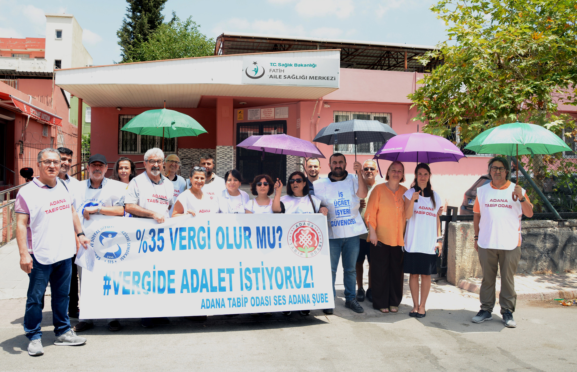 Adana Tabip Odası ve Sağlık ve Sosyal Hizmet Emekçileri Sendikası Yönetici ve üyeleriçalışanlardan alınan yüksek vergi adaletsizliğinin hiç bu kadar şaşırtıcı olmadığını dillendirerek 17 haftadır ‘Vergide Adalet’ istiyor.