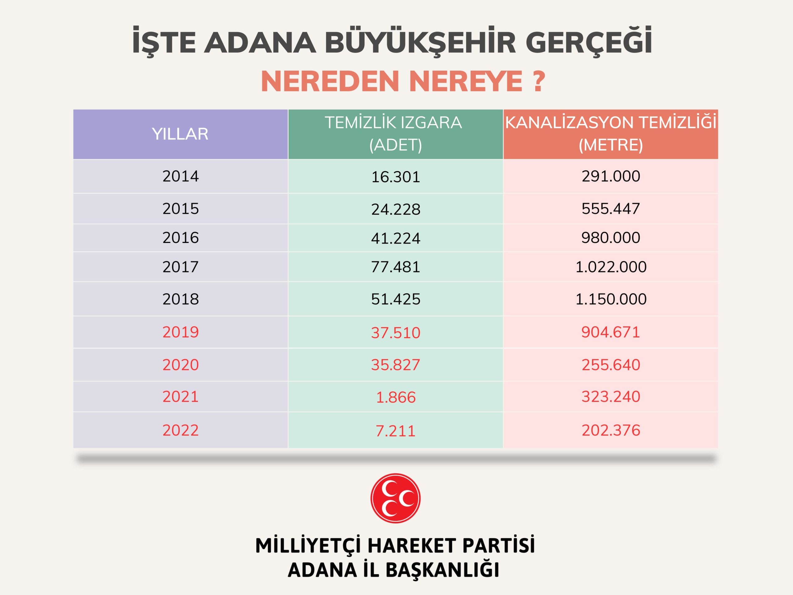 ASKİ’nin 2022 yılı raporuna göre MHP’li dönemde Adana’da yılda 80 bine yakın ızgara temizliği yapılırken, CHP’li dönemde bu rakam 2 binlere düşmüş. Yine MHP’li dönemde yıllık kanalizasyon ve şebeke temizliği 1 milyon 150 bin metreye ulaşırken CHP’li dönemde bu sayı 200 binlere gerilemiş.