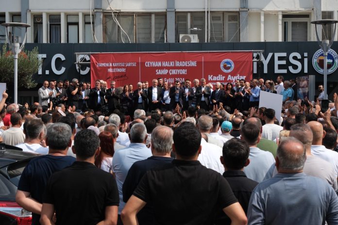 Cumhuriyet Halk Partisi (CHP) Adana İl Başkanlığı, Ceyhan Belediye Başkanı Kadir Aydar’a verilen hapis cezası ve siyaset yasağına ilişkin Ceyhan Belediyesi önünde basın açıklaması düzenledi, verilen karara tepki gösterdi.